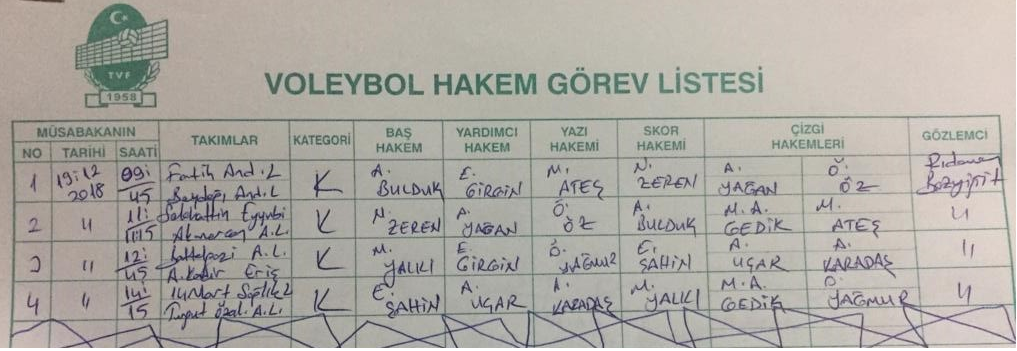 19.12.2018 GENÇLER İL BİRİNCİLİĞİ MÜSABAKA GÖREVLERİ
